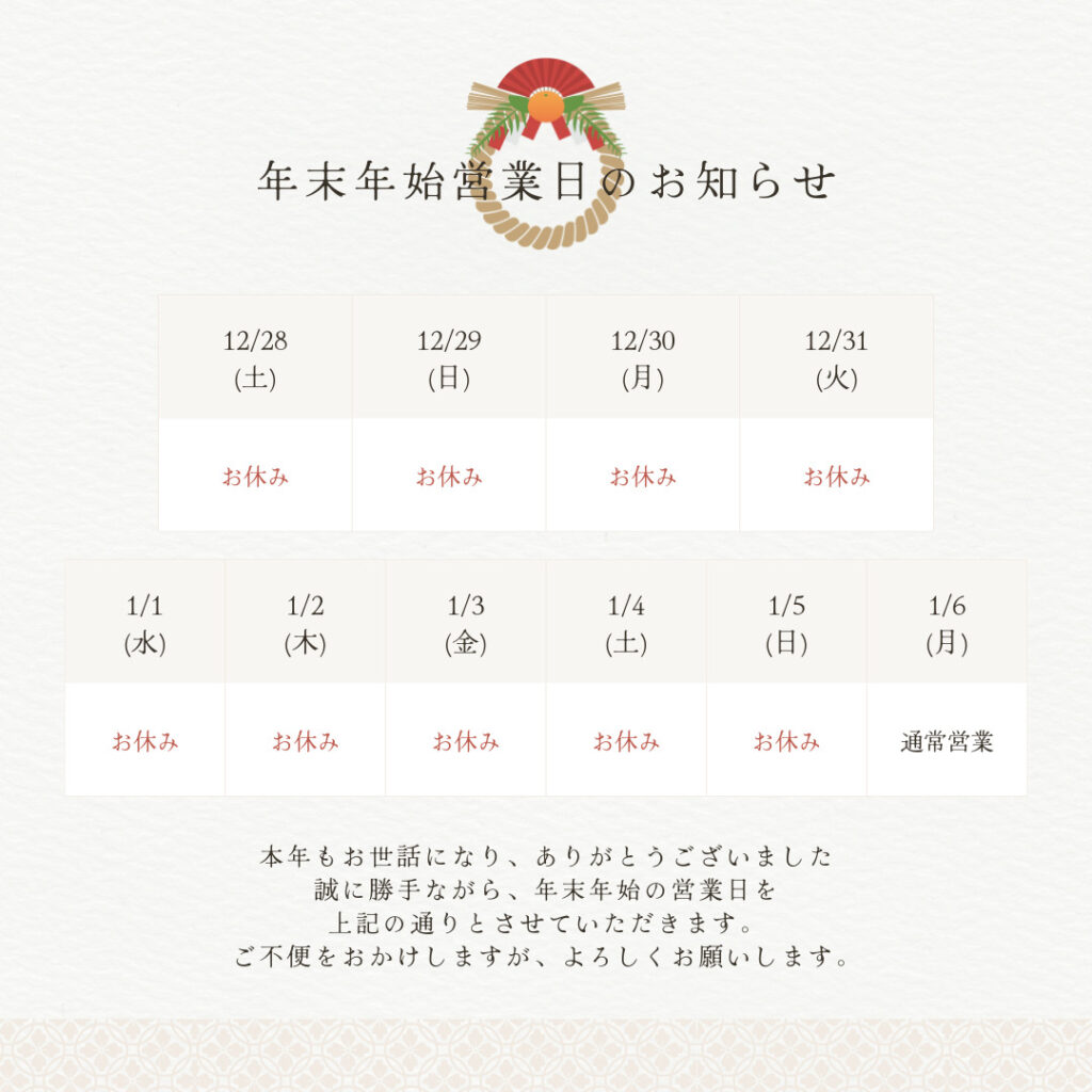 誠に勝手ながら、年末年始休業日を上記のとおりとさせていただきます。